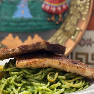 Pair of grilled pork chops, over our pesto pasta «Tallarines Verdes»...